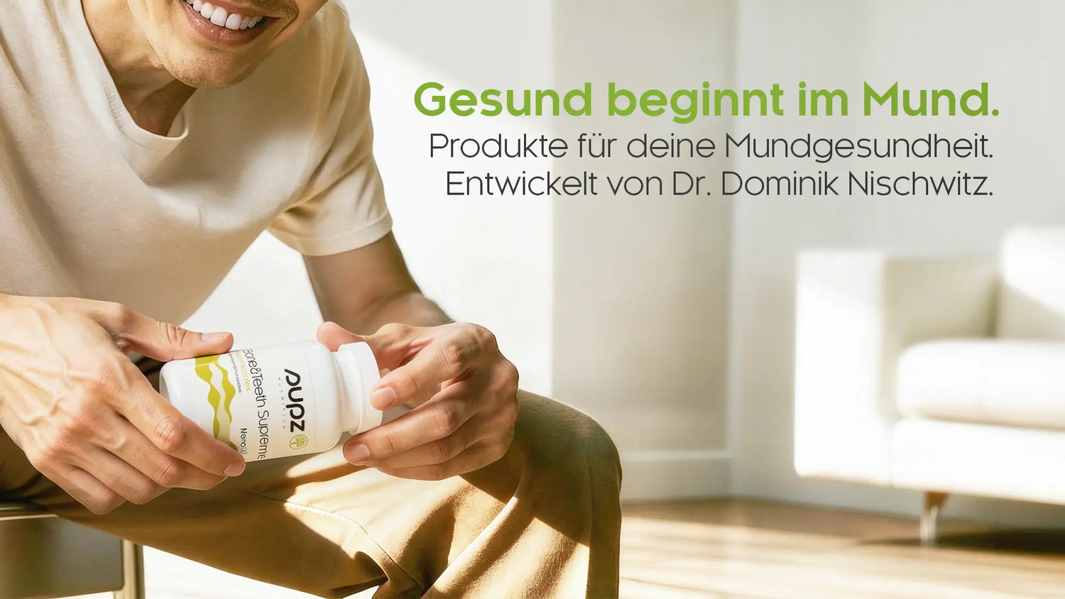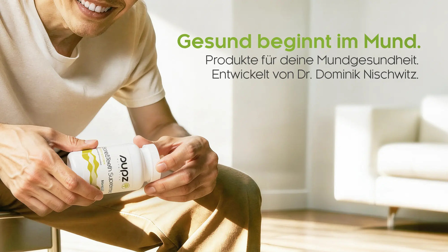 ZUM SHOP!"Genauso, wie man seine Pflanzen täglich gießen muss, sollte man auch seinen Zähnen täglich die richtigen Nährstoffe zuführen." Denn laut Dr. Nischwitz beginnt die Gesundheit im Mund.