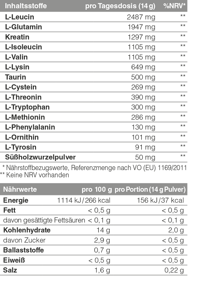 L-Leucin (17,8 %), L-Glutamin (13,9 %), natürliches Aroma, Kreatinmonohydrat (10,5 %), L-Valin (7,9 %), L-lsoleucin (7,9 %), L-Lysin-Hydrochlorid (5,8 %), Taurin (3,6 %), Rote Beetewurzelpulver (Beta vulgaris), L-Cystein-Hydrochlorid (2,8 %), L-Threonin (2,8 %), L-Tryptophan (2,1 %), L-Methionin (2,0 %), Meersalz, Magnesiummalat, L-Phenylalanin (0,9 %), L-Ornithin-Hydrochlorid (0,9 %), L-Tyrosin (0,7 %), Süßungsmittel: Xylit und Steviolglycoside, Süßholzwurzelpulver (Glycyrrhiza glabra), Säuerungsmittel: Citronensäure.