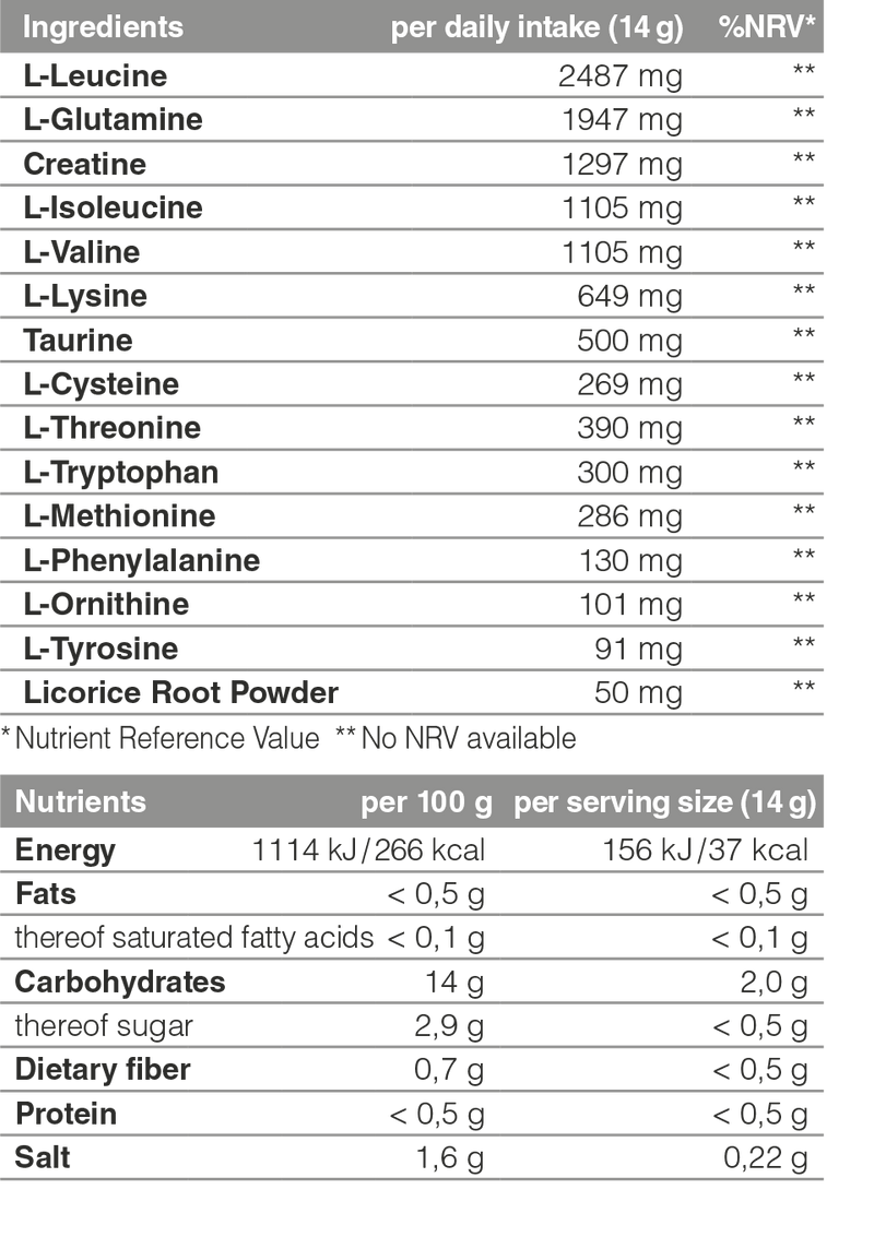 L-Leucine (17,7 %), L-Glutamine (13,9 %), Natural Flavoring, Creatine Monohydrate (10,5 %), L-Valine (7,9 %), L-Isoleucine (7,9 %), L-Lysin Hydrochloride (5,8 %), Taurine (3,6 %), Beetroot root powder (Beta vulgaris), L-Cysteine Hydrochloride (2,8 %), L-Threonine (2,8 %), L-Tryptophan (2,1 %), L-Methionine (2,0 %), Sea salt, Magnesiummalate, L-Phenylalanine (0,9 %), L-Ornithine Hydrochloride (0,9 %), L-Tyrosine (0,7 %), Sweetener: Xylit and Steviolglycoside, Licorice Root Powder (Glycyrrhiza glabra), Acidulant: Citric Acid.